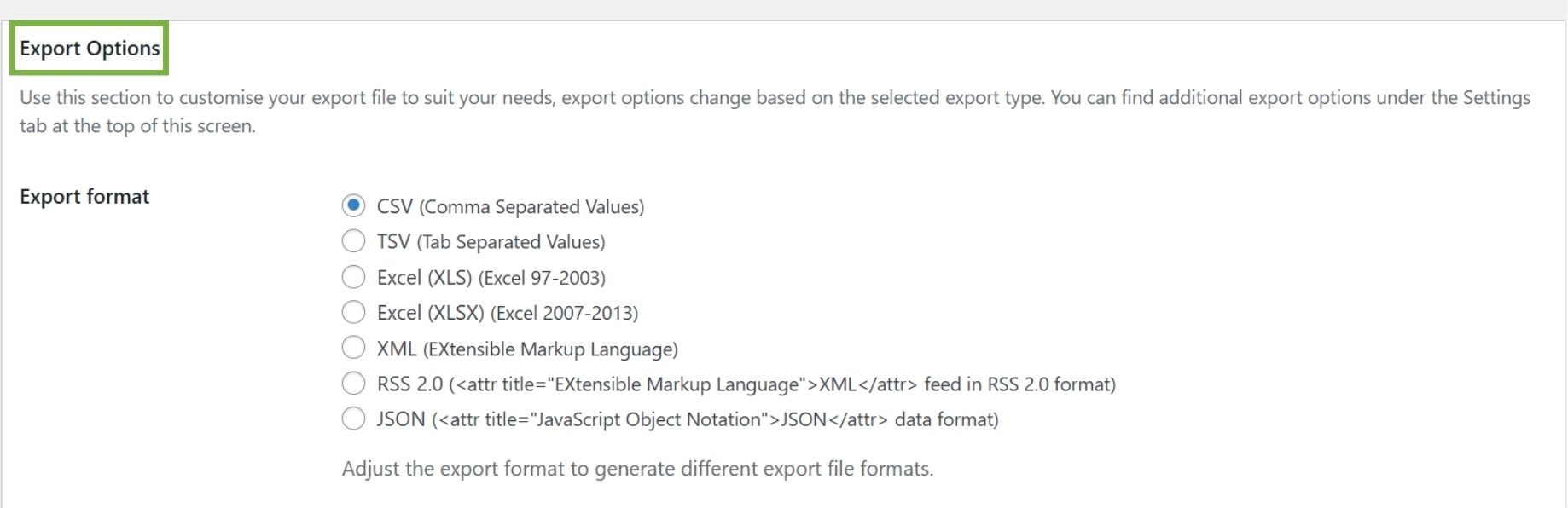 Most export plugins support CSV, XML, and Excel file types. CSV opens in every spreadsheet program including Excel and Google Sheets. XML works best for connecting to other systems or marketing platforms. Meanwhile, Excel files (XLS and XLSX) are ideal for detailed analysis.