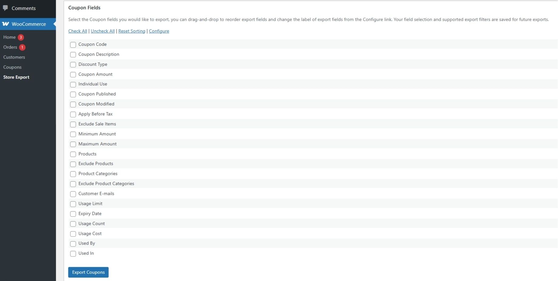 Scroll to the Coupon Fields section and select the data you need. You can drag-and-drop to reorder fields and change labels using the Configure link. Your field selection is saved for a future WooCommerce coupon export.