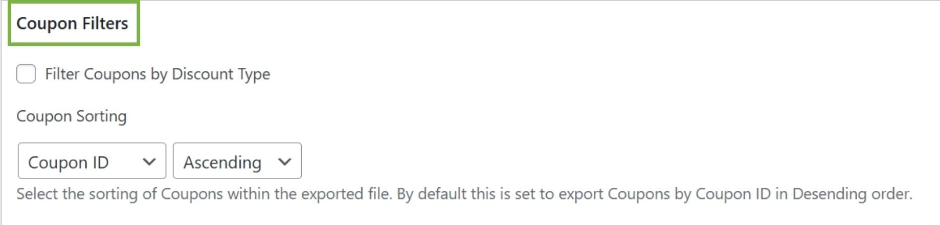 Under Coupon Sorting, choose how to organize your WooCommerce coupon export. The default setting exports coupons by Coupon ID in Descending order. You can change this to Ascending or sort by other criteria.​